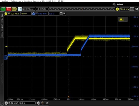 在不带载的情况下(不焊接C6670),测得CVDD(黄色)、CVDD1(蓝色)上电如下图