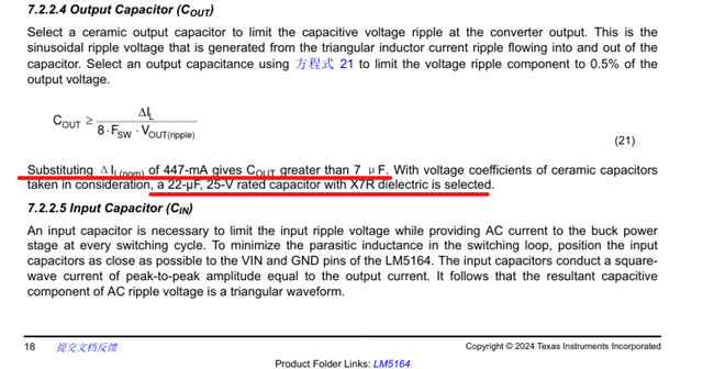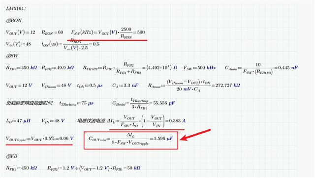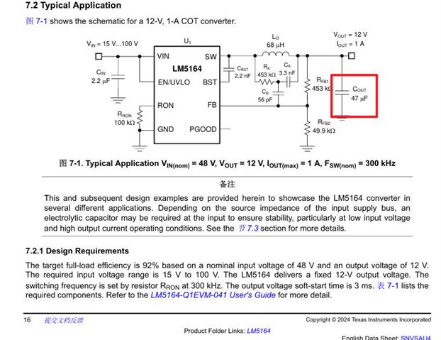 In Section 7.2 (Typical Examples) of the datasheet, it states that Vout = 12V and Cout = 47uF. However, according to the formula provided in Section 7.2.2.4, when working backwards from the noted parameters, it results in Vout being approximately 5V with Cout = 22uF, which is clearly incorrect. How should the correct formula be applied to calculate the value of 47uF?
