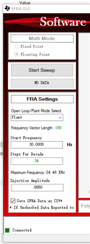 Hello, I am conducting Experiment 2 on the PFC stage. Regarding the frequency sweep of SFRA, the specific frequency sweep parameters are not specified in the experiment manual, How should I set the parameters in the figure? and it is also not stated what the input voltage should be during the frequency sweep.