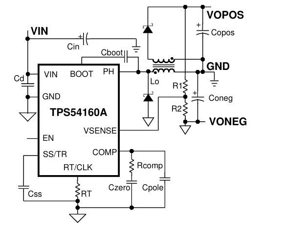 您可以使用两个 TPS40200 控制器,一个以标准降压(BUCK)配置生成 +15V 电源轨,另一个以反向降压-升压(Buck-Boost)配置生成 -15V 电源轨。