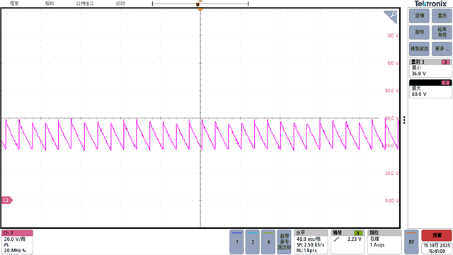 1、The design parameters are as follows: the input source is 57–60 V, and the charging output is 56 V / 2 A. The ACUV pin is measured at 7.4 V and the ACOV pin at 3.4 V, which meet the operating conditions.
