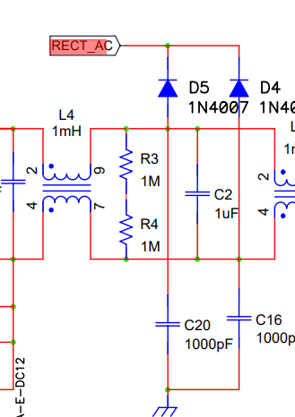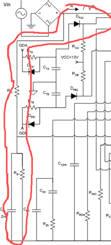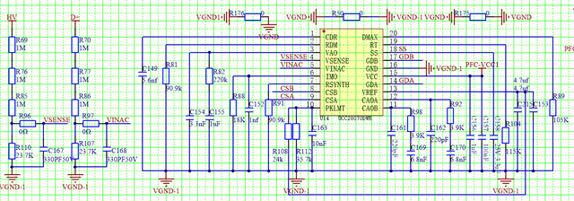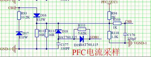 我设计的一个电源3KW,最大占空比97%,频率65K,带载3KW时电流有畸变,帮我分析一下是什么原因,我的电流采样电路在上方,还有一个问题是VINAC有两种方式,1:采集整流桥输出电压接采样分压电阻,2:采集LN的电压通过两个二极管接采样分压电阻那种方式是对的。
