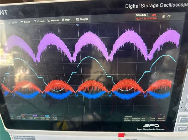 我设计的一个电源3KW,最大占空比97%,频率65K,带载3KW时电流有畸变,帮我分析一下是什么原因,我的电流采样电路在上方,还有一个问题是VINAC有两种方式,1:采集整流桥输出电压接采样分压电阻,2:采集LN的电压通过两个二极管接采样分压电阻那种方式是对的。
