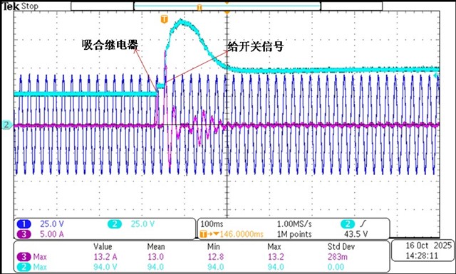 我后来也发注意到了网侧电压和电容器电压存在差异性问题,在新的启动方案中,我提前一个工频周期闭合继电器,此时电网电压通过低阻抗路径(继电器和LMG3522R030)与电容器连接,此时LMG3522R030器件工作在不控整流模式。一个工频周期后,在网侧电压过零点进入闭环系统,开始给LMG3522R030器件驱动信号。此时依旧有较大的浪涌电流,启动波形图如下(输入电压有效值30v,负载500Ω)