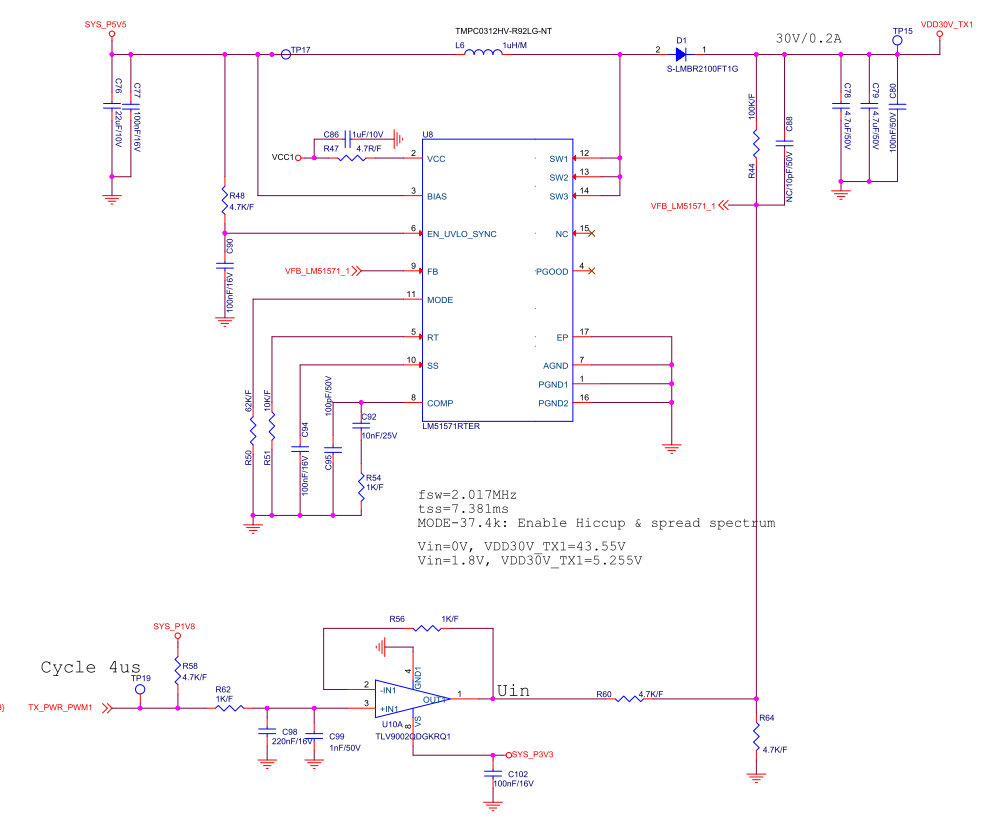 LM51571设计了一个升压电路(如下图一),由5.5V升压到17V(平均电流约0.2A),给激光发射器供电。现测出来输出波动较大(如下图二,VPP接近3V),应该是受到激光器工作导致。但看起来像是电源无法响应负载快速的变化。尝试了降低开关频率到450KHz,修改COMP管脚器件参数,输出没有任何改善。所以需要支持: