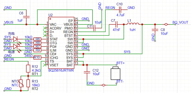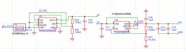我目前设计的电源如下:TypeC -> BQ25616JRTWR电源管理芯片 -> TPS61022RWUR转成5V -> TLV62569DBVR将5V转成3V3(这个3V3电源给ESP32芯片、ISOW7842DWER隔离芯片供电)