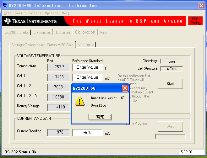 通过EV2200对BQ2060A进行电流校准时显示“Run-time error '6' overflow!",请问该如何解决,是某个参数设置不正确吗?