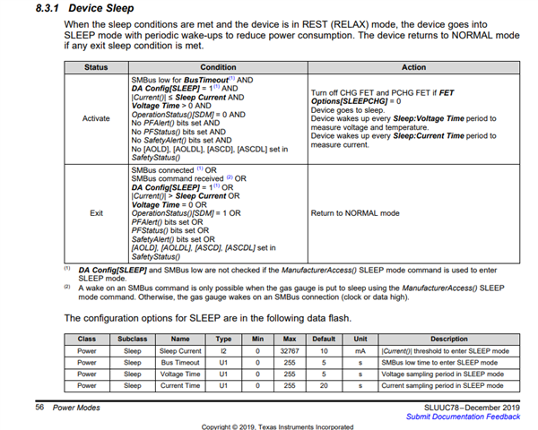 BQ78350-R1+BQ76930  方案,拔掉外设和对外供电接口,拔掉通信接口,DA configuration中SLEEP位置1,Sleep Current =10MA,Bus Timeout =5s, Voltage time= 5s,Current time=20s,等了好久整板无法进入sleep状态,整板的电流大概在2mA左右。电池是10串。电池打压等都已经输入中等偏上的电压范围。请问:1,我上述情况还有什么原因会导致进不了Sleep模式,2,Sleep模式和shutdown状态有什么区别?