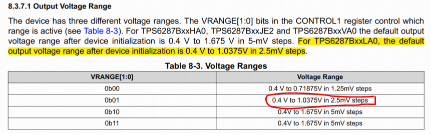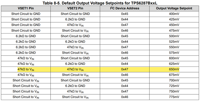 我用TPS6287B20LA0WRZVR硬件配置上VSET1,VSET2是像 TPS6287B25EVM-024那样输出的0.75V,如果我通过I2C修改了VSET 寄存器为0x64,将输出改为0.65V,断电后能保存该配置吗?目前正在原理图设计中。