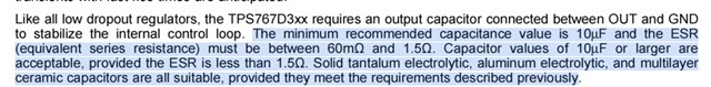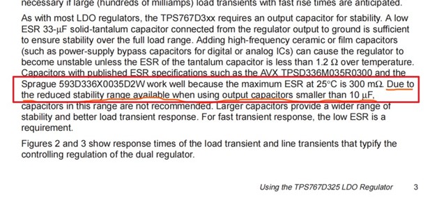 • 查看使用的LDO芯片手册(TPS767D3)有提到建议使用的输出电容最小容值为10uF,同时在其应用手册中,提到如果使用的输出电容容值小于10uF会导致可用的稳定性范围减小,详细如下图所示。实际应用电路中,1.8V输出端其负载电流为276mA,使用的输出电容为10uF的钽电容,从电路器件设计参数考虑,是否可能导致电路稳定性较低,进而输出电压波形呈锯齿波?