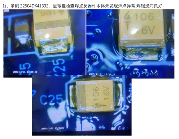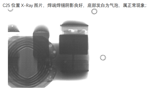 • (1)我们也怀疑过焊接问题,将部分异常单板送回焊接厂家进行了分析,包括显微镜检查焊点和锡膏润湿明显,进行X-Ray照射检查焊端焊锡,检查结果均正常,3个单板C25钽电容的焊端是满足标准 IPC-A-610 H 的标准中关于焊接外观的 3 级要求(3 级为最高要求,一般是按 2 级要求执行)。以下为一些焊接检查的图片,以供参考。