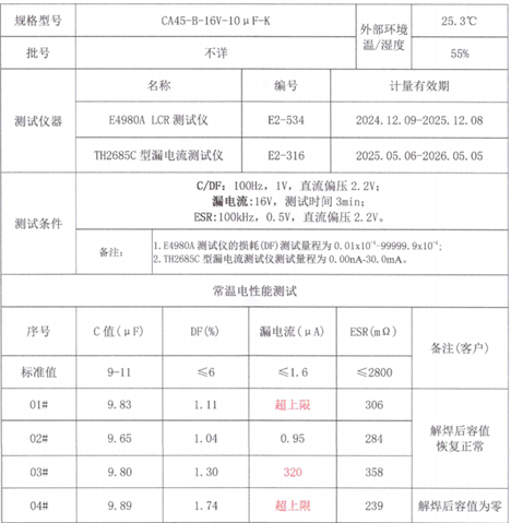 (2)同时,我们也对C25坦电容送检进行了失效分析,4只送检样品,仅发现其中3只样品的漏电流不合格,其他检查项均合格!且分析厂家未能给出失效明确原因!下图为失效分析报告中的电性能测试记录图片,以供参考。