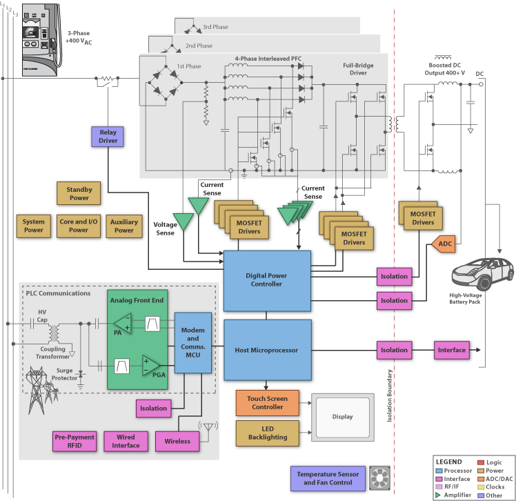 用于这些汽车的 3 级充电系统包含一个 AC/DC 转换器,可从 AC 线产生 DC 电压。这些输入电源需要经过功率因数校正 (PFC) 来提升功率因数以符合地区法规标准。反向器的核心是实时 C2000 微处理器。此控制器被编程为执行控制环路以实现所有必需的电源管理功能,包括具有 PFC 的 AC/DC 和 DC/DC 以创建必需的电池充电配置文件。C2000 控制器包含先进外设,例如高精度 PWM 输出和 ADC,可读取 ADC 并在单个时钟周期内调节 PWM,从而实现实时控制。
