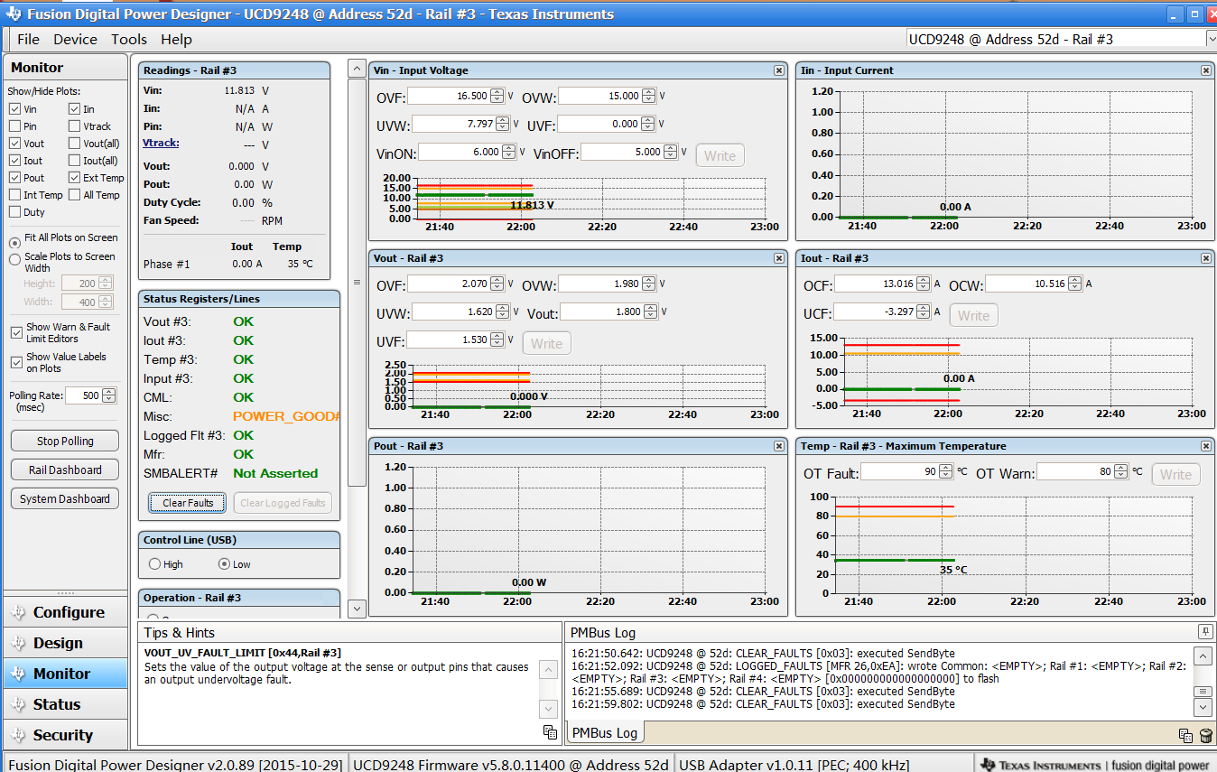 您好,我想问一下PTD08D210W使用方面的问题,用UCD9248配置PTD08D210W,在线配置完后发现PTD08D210W输出电压为零,并且温度在5s内上升到了80度,断电后发现PTD08D210W的输出是和地短路的,但是配置之前PTD08D210W的输出并没有短路到地,并且再次上电把Flash擦除后掉电测量输出依然短路,尝试着把电源模块上的输出电容拆下后测量,发现电源模块上的UCD7242的电压输出引脚是和芯片的地近似短路的,电阻只有几欧姆。这种情况是因为PTD08D210W芯片损坏吗?