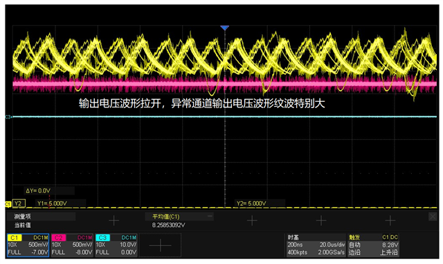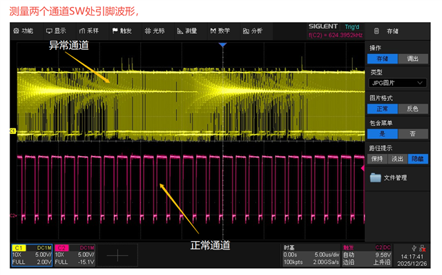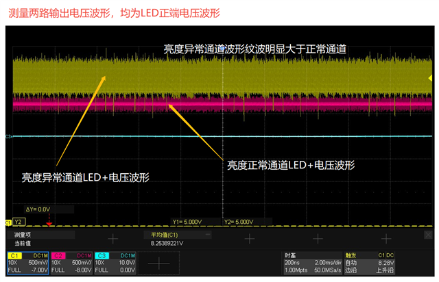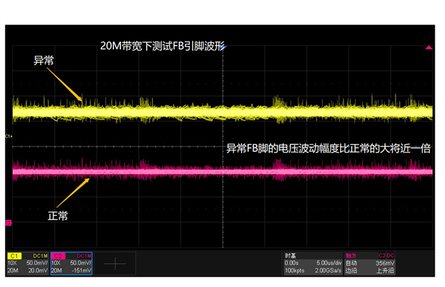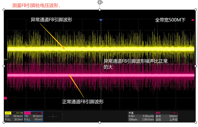 从开启LED到关闭LED的正常的波形如上图,在异常的时候会出现高电平阶段波形变得很粗(纹波很大),异常的时候测量SW和FB脚的波形也是纹波很大,这种异常不是必然发生,发生的概率比较低(难以复现),断电重启之后又恢复正常,这种会是什么原因导致的