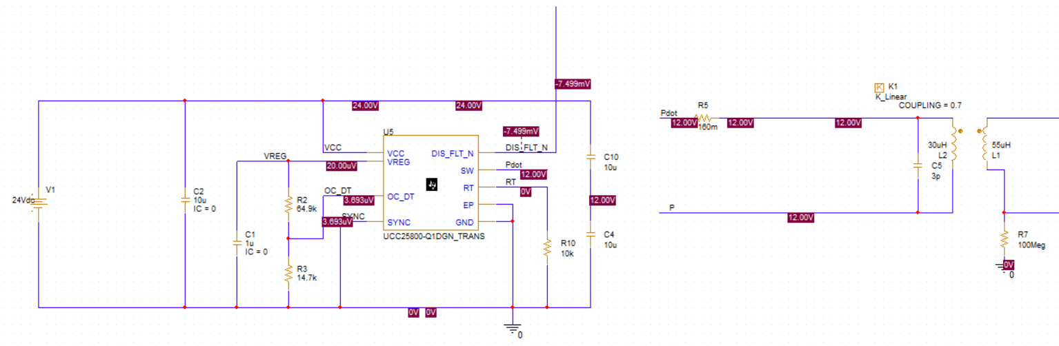 在仿真过程中,我们发现UCC25800的DIS_FLT_N在仿真5ms后从高电平5V掉到了低电平0V,同时SW引脚也停止工作。
