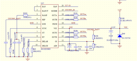 UCC3895接负载4A负载时正常,8A,震荡比较严重,导致MOS管发热。目前找不到问题原因,需要有调试经验的工程师帮忙看下客户的原理图是否有问题。