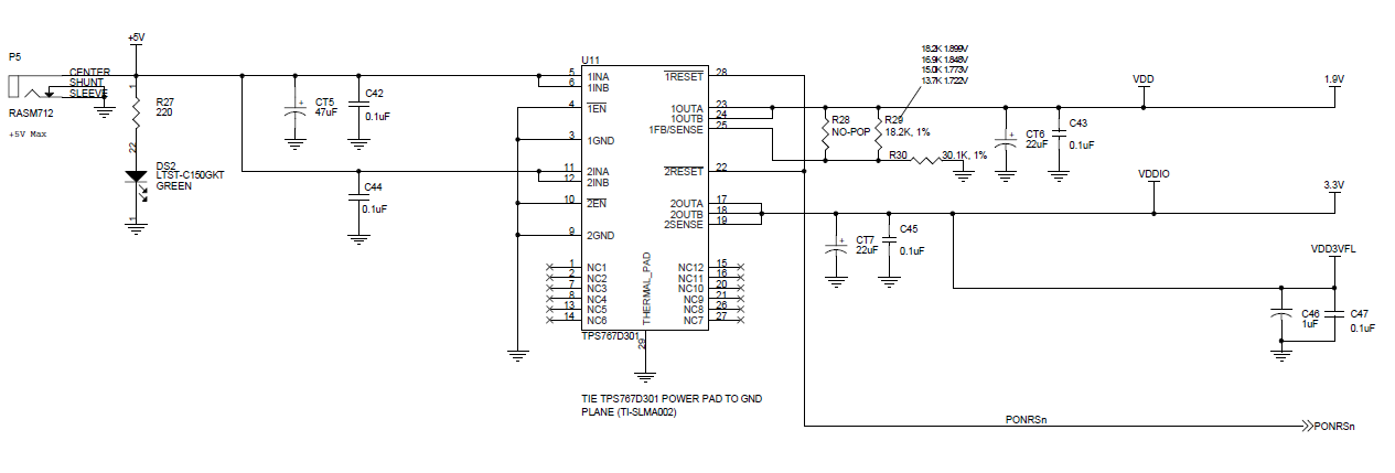5V输入是外部开关电源供电,供电很稳,其纹波噪声为80mV,但是TPS73HD301的28#脚输出低电平