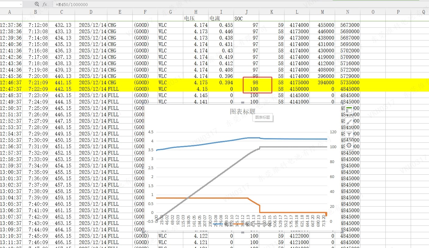 日志数据显示 4.178V SOC=98%;4.165伏SOC=100%;