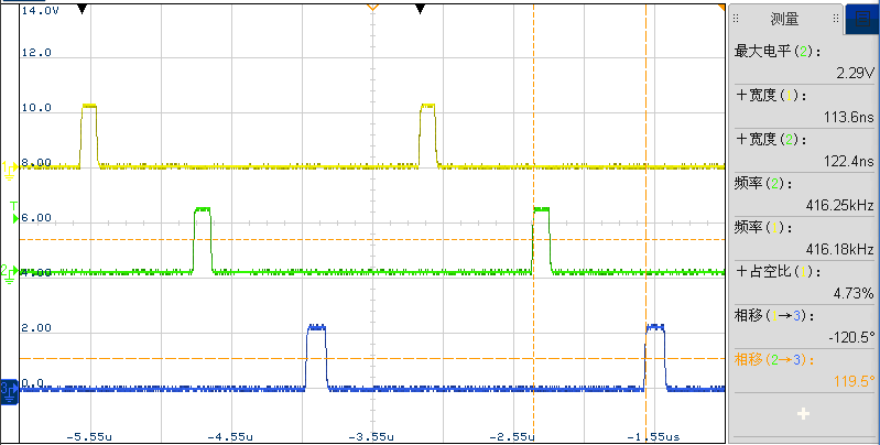 根据外部时钟和内部时钟的匹配关系,外部时钟设置的频率为416kHZ,输出3路复制在2-3V之间,脉宽为120ns左右,相移为120°