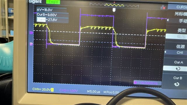 - The test waveforms are as follows: After changing R1 to 20 Ω and adding a 10 kΩ pull-down resistor from the G-pin of Q3 to GND, the surge at the G-pin of Q3 gradually became smooth, but the waveform at the LED+ output of the load remained unchanged.