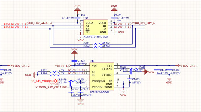 设计中有使用TPS51100DGQR这款电源芯片,该芯片输出经过一个50R的排阻上拉DQ信号(DQ是双向信号:有输入输出),发现DQ输出结束的时候,会有一个抬升的电平在经过4uS下降到0,目前验证过将TPS51100配置成高阻,0和1,并且确定生效了,都不能改变该现象,将排阻拆掉相当于断开TPS51100芯片的影响,现象恢复,如图所示,请帮忙看看有什么好的建议,谢谢!