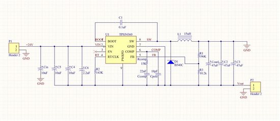 anqiang ren1 你好,这个电路是对的,我做出来电流小点的时候很稳定。至于你说不分正负和带正负的话这个ti手册上说是用ESR小点的X7R或者X5R,而我手头有好的钽电容,ESR很小,很适合输入滤波,所以我也画上去了。 我这边C4.5.6都是Cd ,我那个Cin是为了给输入的电源滤波的。