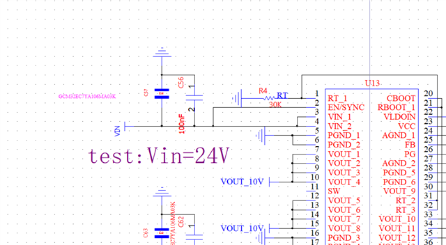 As shown in the following schematic, there is no output. RT was adjusted from 13K to several parameters up to 33K, but the fault remains. With a 24V input and no load, the total current jumps briefly from 11mA to 8mA and then stays at 11mA. The VCC output is around 250mV. At the R5 position, both 0-ohm and open-circuit configurations were tried, but the fault persists. Please help analyze the cause. How likely is it a problem with the SMT components? Both of the two PCBA units installed show similar issues. 10V.pdf