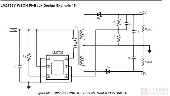 在使用LM2735作为-+12V的电源,看到了使用手册具有相关电路,但是其中的变压器型号,性能全部没有说明。请问具体选型是什么?