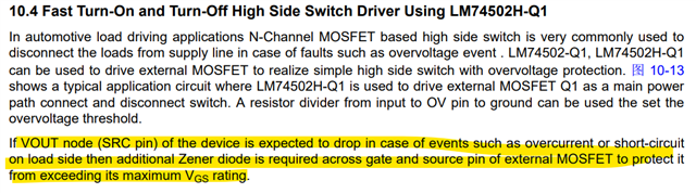 数据手册中有多处介绍了关于zener保护相关的内容,您可以参考看看,https://www.ti.com.cn/cn/lit/ds/symlink/lm74502h-q1.pdf