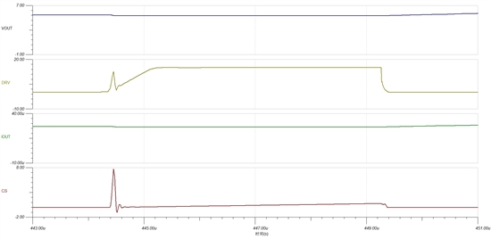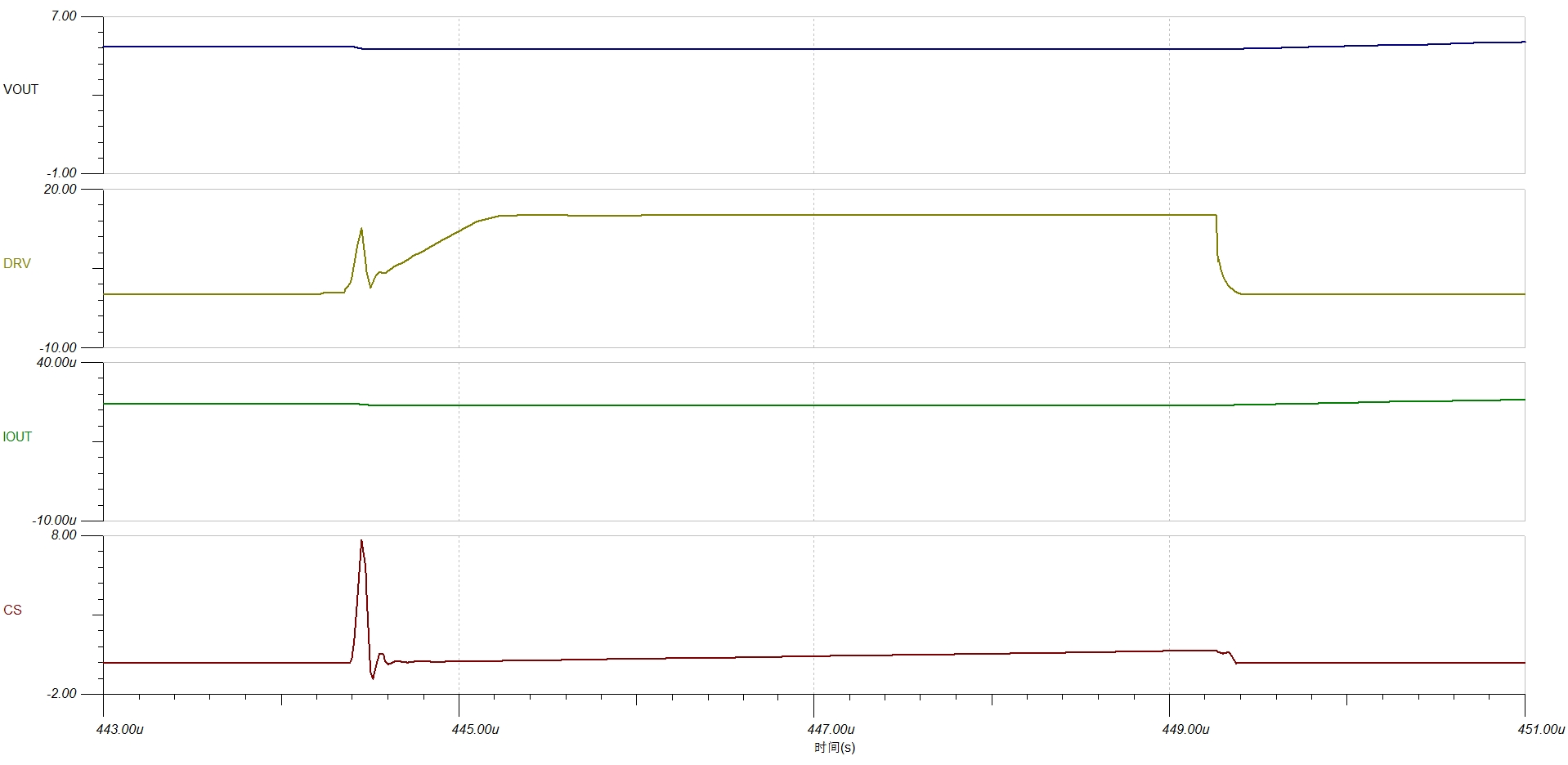 2.CS脚电压会有一个6V的尖刺,和DRV脚的尖刺能够对应。