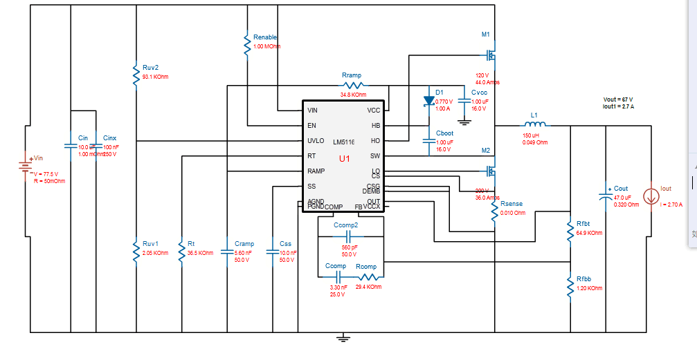 我原来有咨询过我的一款新产品,DC输入是75-85V 5A,DC输出是67V,2.7A,贵司给我推荐了LM5116这款芯片,我现在用该款芯片按照贵司的设计工具设计了一款原理图,请师傅帮我看看是否可行?如果可行,在设计PCB时要注意哪些事项?