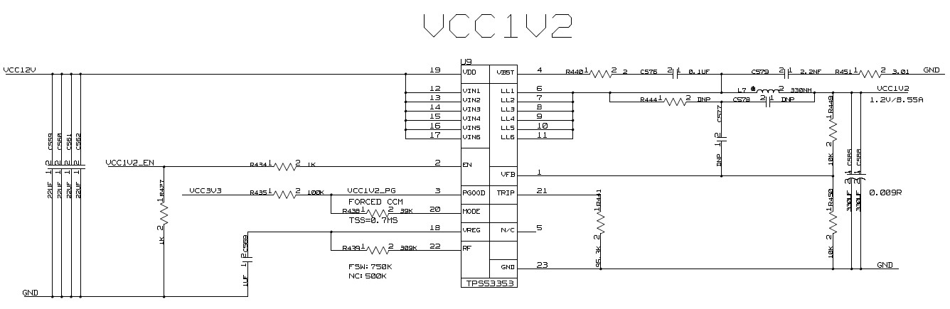 您好!对于TPS53353在我的板卡上的应用为:12V输入、1.2V/8.55A输出。帮忙check一下原理图(Fsw=750K),对应的设计如下: