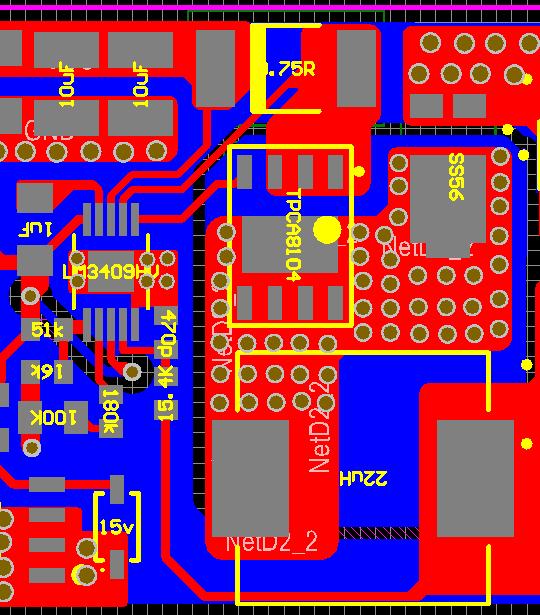 板子焊好了用LM3409HV,输入12v-32v. LED灯电压9v 电流2.2A. 电感22uH(10*10 TDK)COFF脚是470p+15k. PMOS管TPCA8104.现在问题是当电压调到30v时PMOS管发热严重(12v-22v发热不严重)。求指点!!!