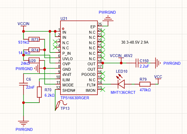 在TPS16630RGER输出接三个TPS54560BQDDARQ1和直接连接到电机驱动的MOS管,似乎在一次短路后TPS16630RGER烧毁,没有触发保护。