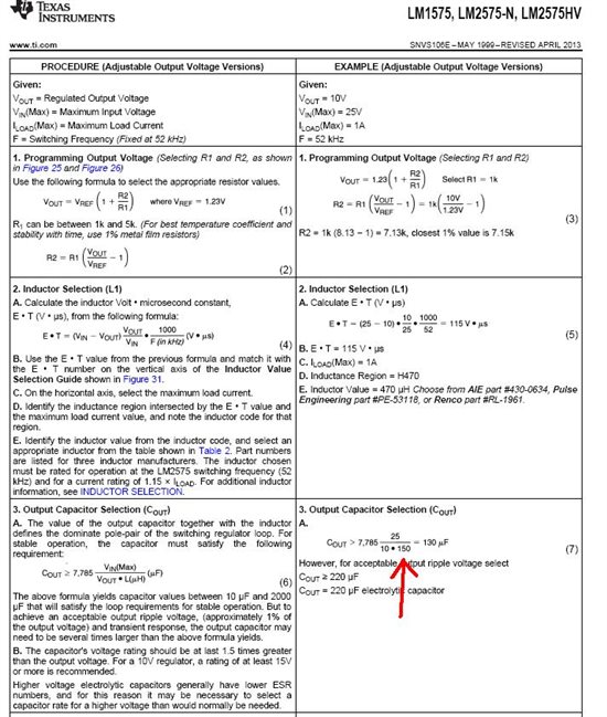 疑问:LM2575HV 参考手册(LM1575/LM2575/LM2575HV SIMPLE SWITCHER 1A Step-Down Voltage Regulator。SNVS106E –MAY 1999–REVISED APRIL 2013)第15页中EXAMPLE (Adjustable Output Voltage Versions)的第三步“输出电容”计算部分 150uH是如何得出的,第二步中的设计电感为470uH?