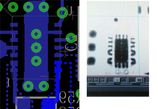 4/ 设计的焊盘封装是根据芯片手册的尺寸来设计,尝试重新设计TPS63020的焊盘,把管脚和GND的距离加大,重新打样,发现问题一样。 下面是新的焊盘图和通过x-ray 透射之后的图。