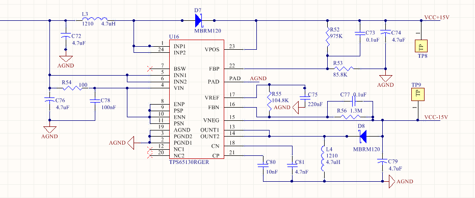 我使用TPS65130输出+-15v电压,电路是按照数据手册上的参考电路设计的,输入电压5v,但是输出电压不正常。