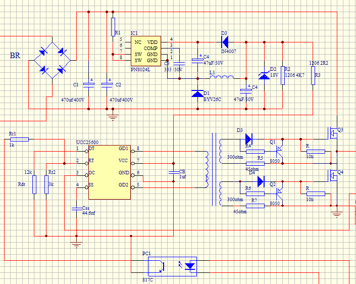 现在公司要做一款1000w电源,用llc拓扑,ic为ucc25600。现在UCC25600无法启动,给其电源加12v电压,软启动电容电压要大于1.2v芯片启动,但现在其接近0v。请教各位老师,如何解决?谢谢。