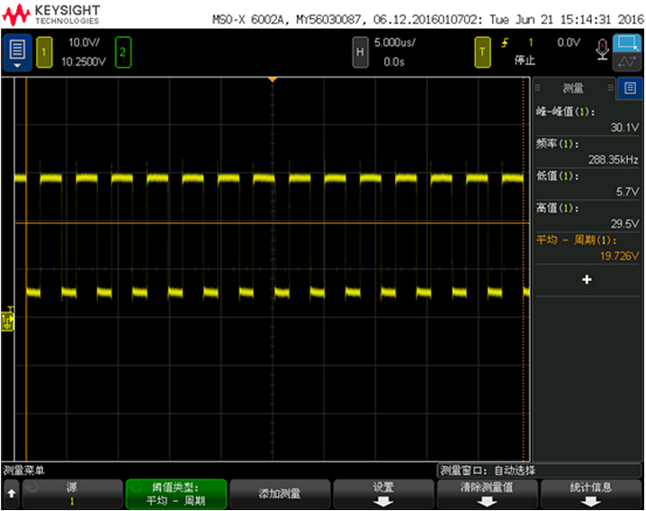 满载时候,BST上电压(也是矩形脉冲,不像空载那样是间歇性质的。我觉得空载的时候应该是DCM模式,而现在接负载后为CCM模式)