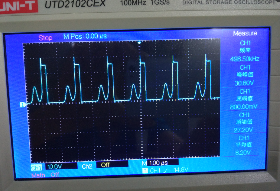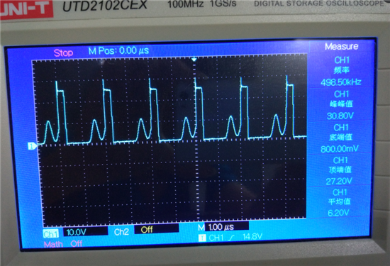 目前只是暖手,比手指温度高一点点,约35度。刚加入约2W的外围模块。波形的确变好了一些,有时候是方波,有时候也是上图的波形。电路输出5V,外围模块耗电大约400MA。测试时电源电压24V,电流115MA左右。外围模块直接使用24V供电时耗电95MA左右。对比起来貌似电路的效率挺高的,但是发热却严重很多,在几分钟内大概到了40度左右,因为需要做其他的测试,所以没有一直通电测试。