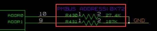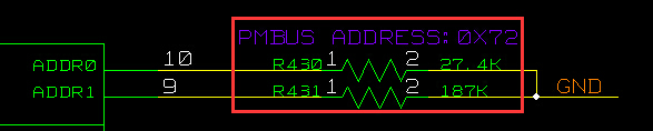2、我的设计中对于ADRR0(Pin10)这个Pin接的是27.4K的电阻,ADRR1(Pin9)这个Pin接的是187K的电阻,这样按照Datasheet描述的PMBus地址是0x72,对吗?请问这个地址可用不?