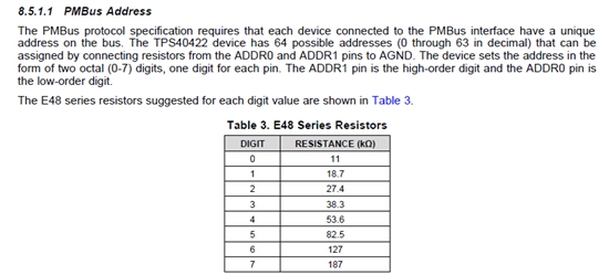 1、在TPS4002的Datasheet中的8.5.1.1章节中描述“The PMBus protocol specification requires that each device connected to the PMBus interface have a unique address on the bus. The TPS40422 device has 64 possible addresses (0 through 63 in decimal) that can be assigned by connecting resistors from the ADDR0 and ADDR1 pins to AGND.”是说PMBus的地址只能为0~64吗?大于这个值是不行的吗?
