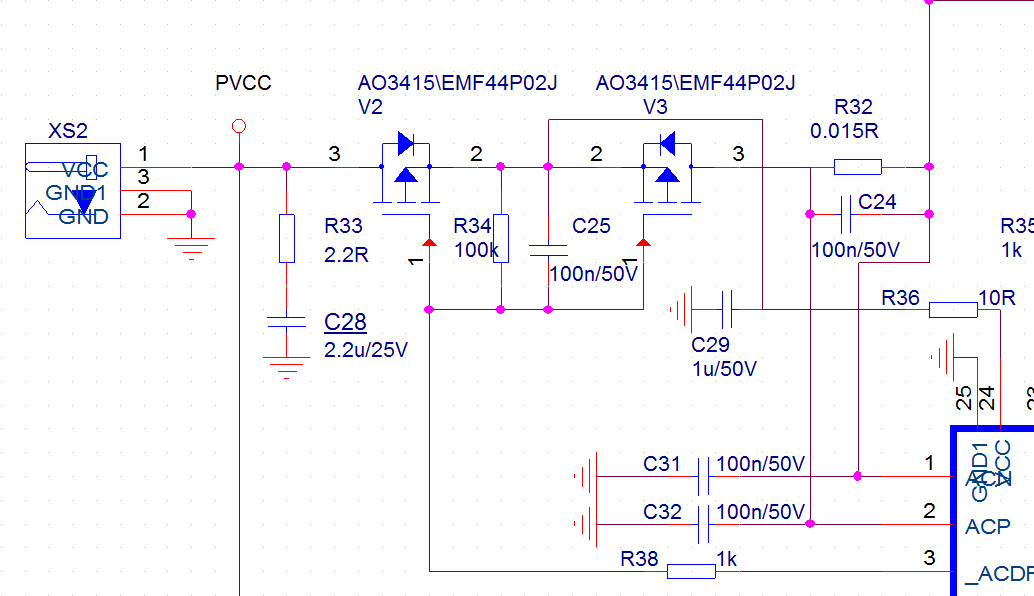 • V2,V3的公共端应该是先接到电阻R36,然后R36再接到芯片的VCC电源脚的!此处连接有误。你现在烧MOS的原因可能就是VCC这块上电导致ACDRV驱动MOS导通不是很快造成的。