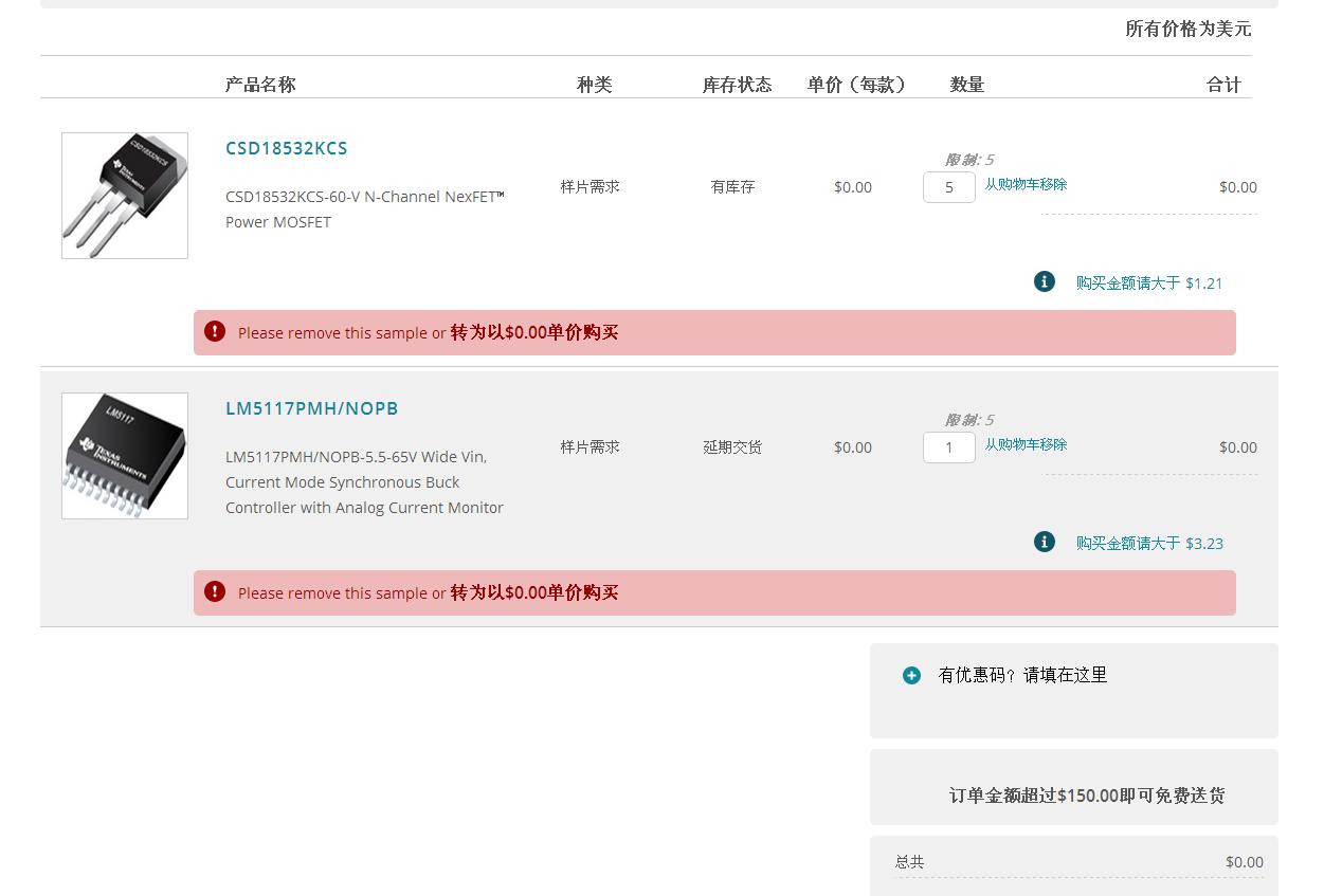 首先你有My Ti账户,同时注册信息是有完整公司信息的,特别是公司地址,公司网站,联系电话,公司邮箱必须要有,这些基本条件具备后,每种芯片至少可以申请5pcs 免费样品,种类没有限制。注意,注册信息很重要!