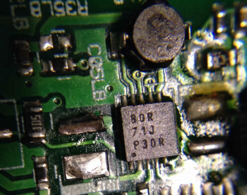 你好,我有个板卡没有图纸,想鉴定图片中ic的型号(丝印内容 BOR 71J P30R不知道是否有错请参照图片),芯片前后有两个胆电容(图上已经拆下),图上有电感,判断估计是电源管理芯片,升压型,前端和后端电容电压分别为6v和18v,求鉴定,谢谢