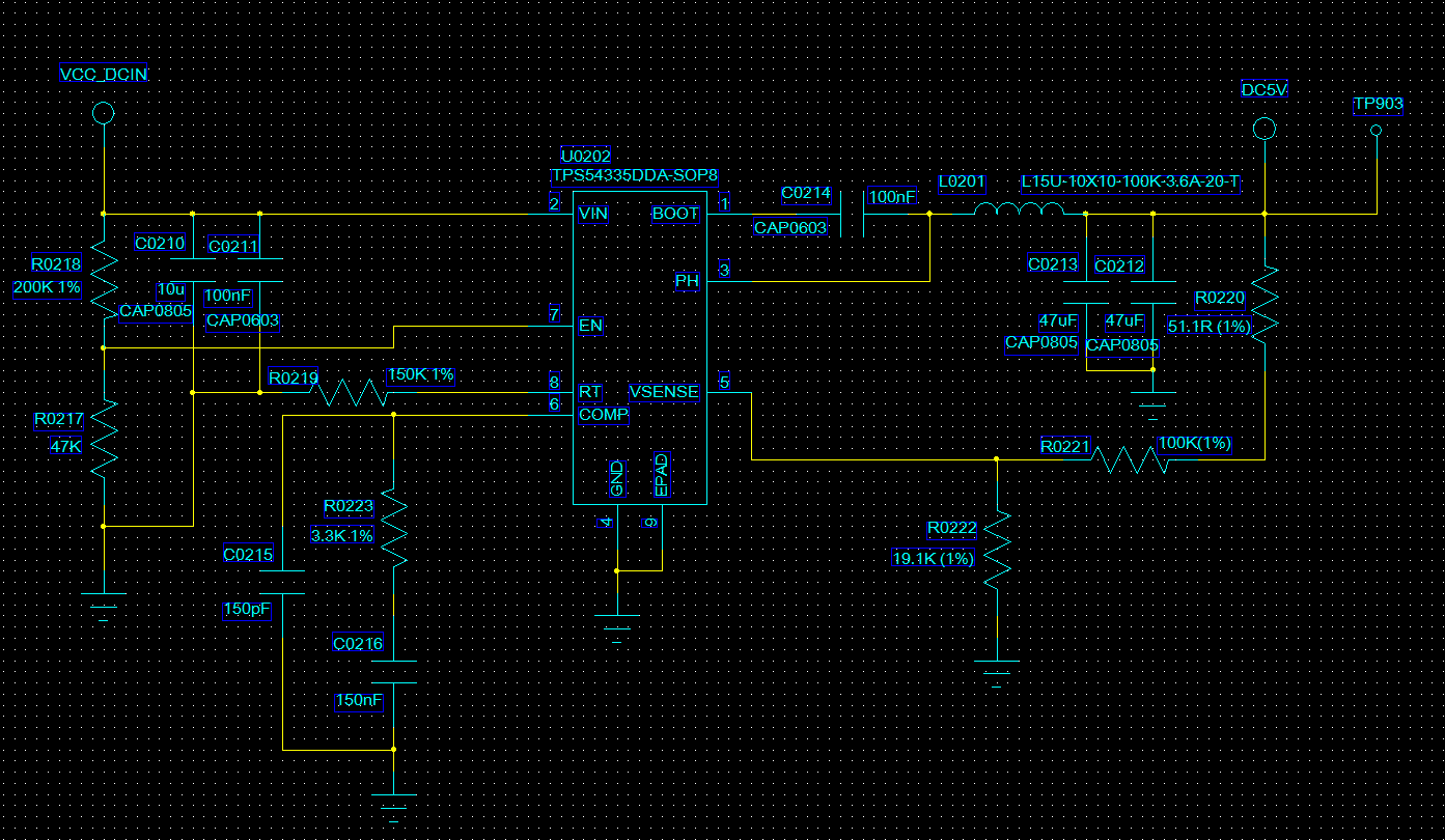 现在的适配器电压为24V,使用降压DCDC TPS54335DDA,实现24V降压为5V,TPS54335DDA的输入电压范围为4.5-28v;