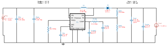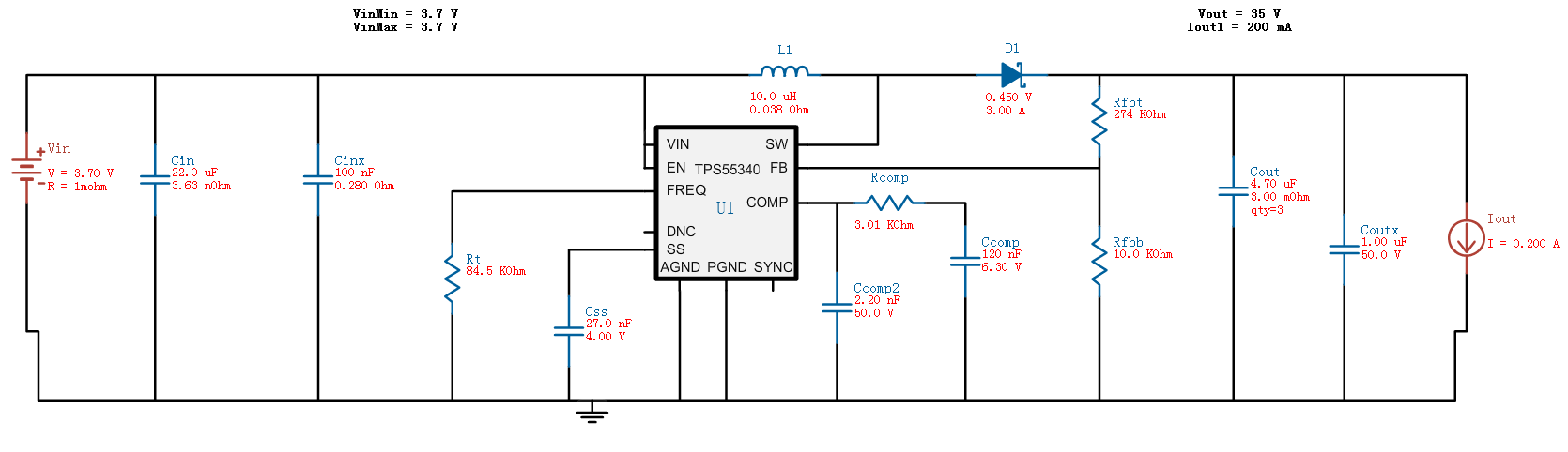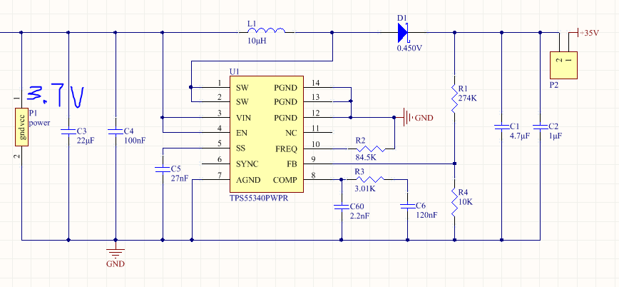 我最近在用TPS55340芯片做升压电路,想由3.7V的锂电池作为输入,输出35V电压、0.2A电流,在webench上进行设计完成之后,自己画了电路图,板子拿回来之后实测发现:当我输入电压为3.7V时,输出电压也为3.7V,而且焊接两块板子都是这种情况,所以基本可以排除焊接问题,应该是原理上出了问题,所以贴出来给大家看看,希望能得到指点。