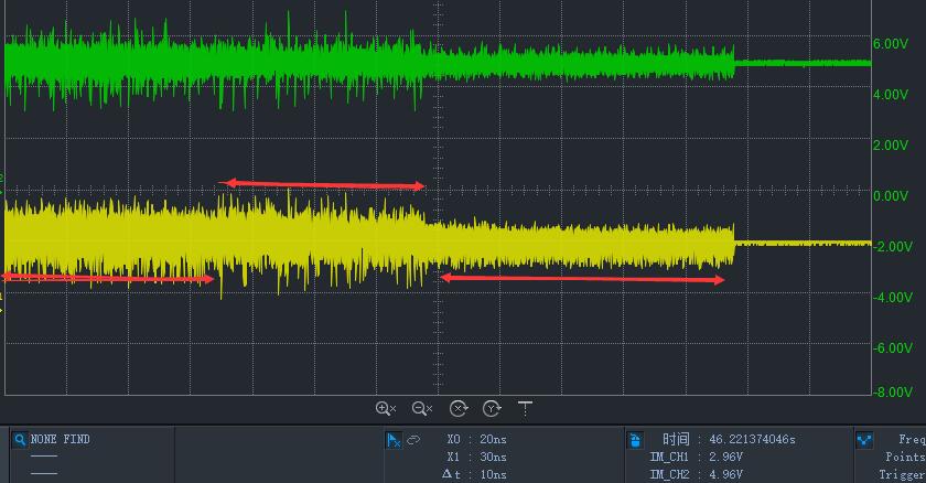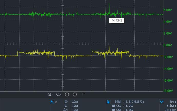 通道2是电源电压,通道1是电流传感器采样出来电压。波动比较大,没法采样准确,还请教这是什么问题。