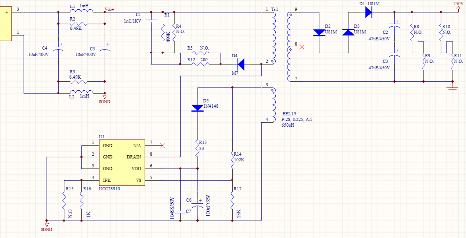 预想设计一组 输入90-260Vac 输出750Vdc 功率6W 的隔离升压电源,